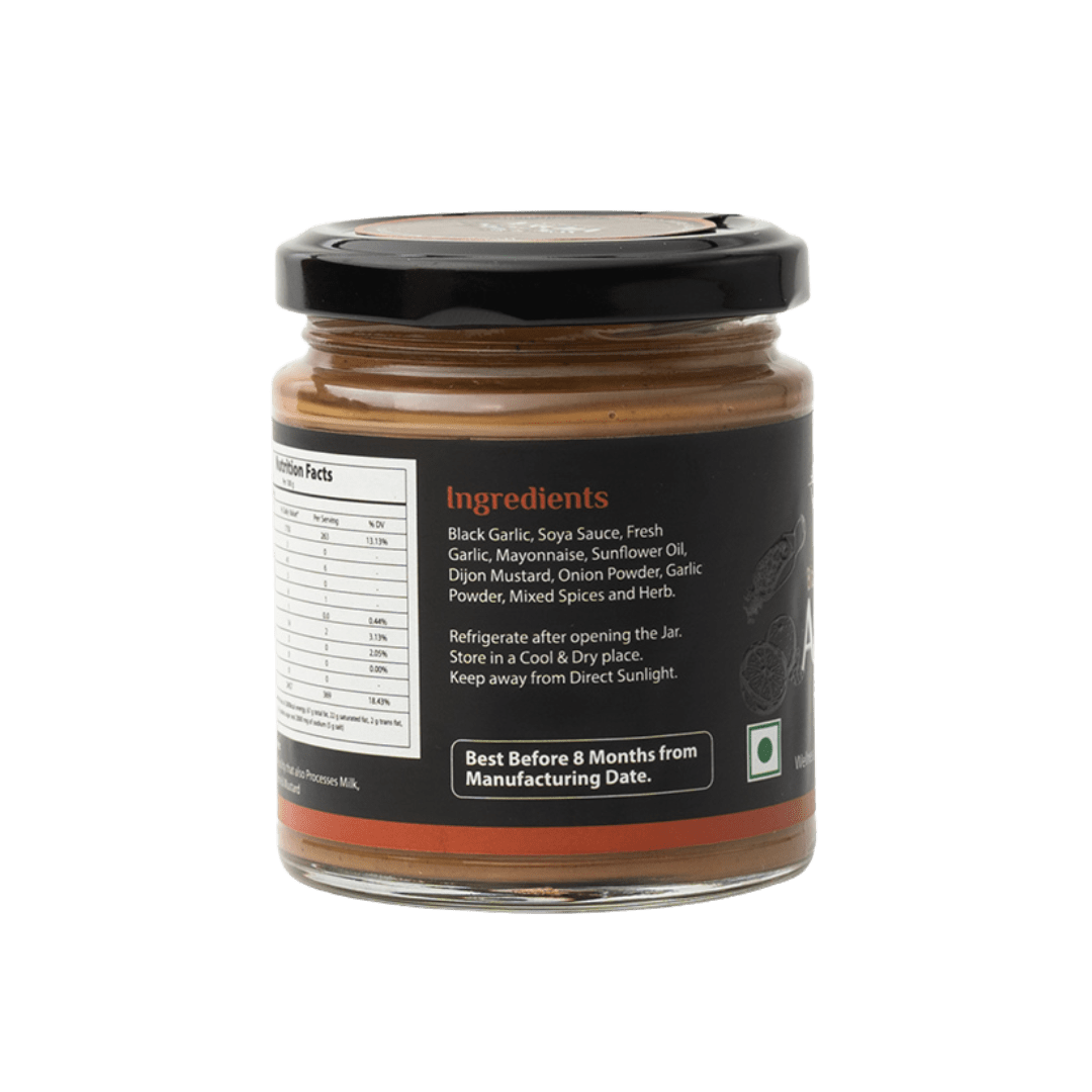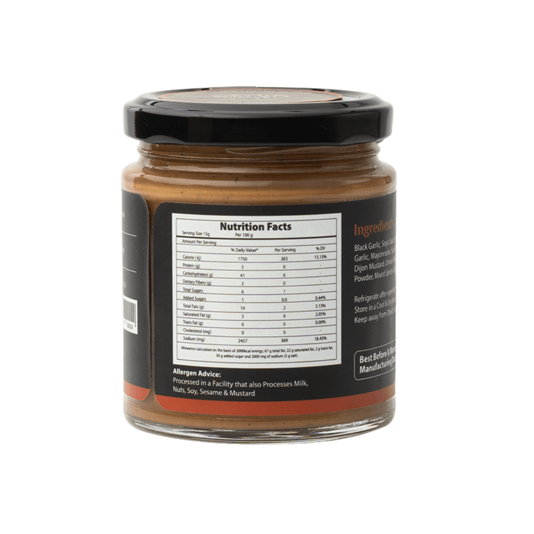 Black Garlic, Soya Sauce, Fresh Garlic, Mayonnaise, Sunflower Oil, Dijon Mustard, Onion Powder, Garlic Powder, Mixed Spices and Herb.